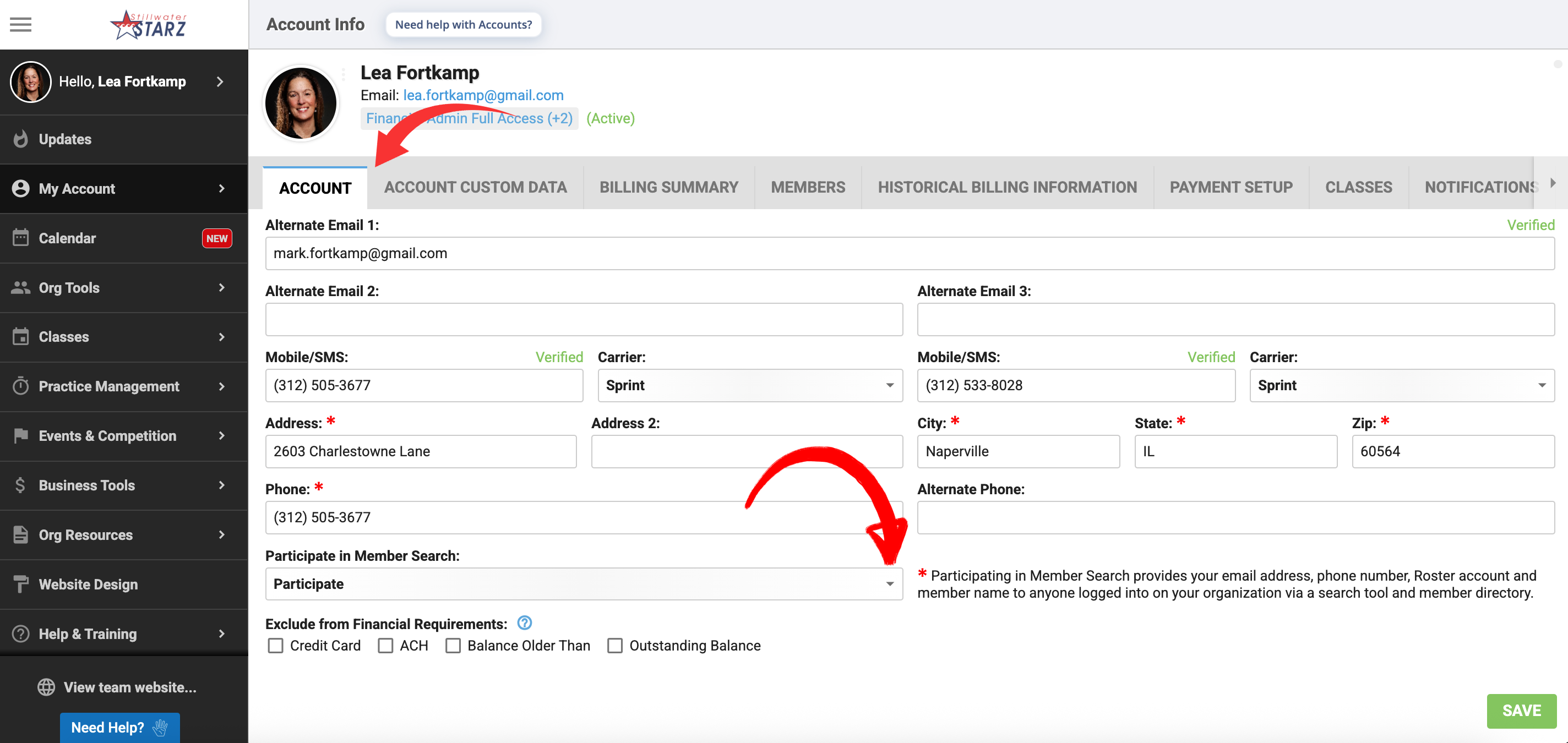 The default setting is inclusion in the Starz family directory. If you would prefer that the parent contact information on your account (and your swimmers’ names) NOT be included in the directory, simply log into our website before we publish the directory on Tuesday click on “My Account,” then select “Do Not Participate” from the drop-down menu shown below. Finally, click the green “Save” button in the bottom right corner to confirm your preference.